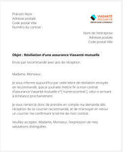 Je vous informe aujourd'hui par cette lettre de résiliation envoyée en recommandé, que je souhaite mettre fin à mon contrat d'assurance Viasanté mutuelle n°(indiquez le numéro de votre contrat), celui-ci arrivant à échéance prochainement.