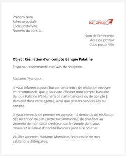 Vous trouverez ci-dessous un exemple de lettre de résiliation d'un compte Banque Palatine :