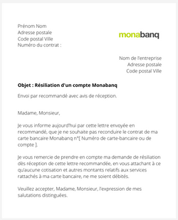 Je vous informe aujourd'hui par cette lettre de résiliation envoyée en recommandé, que je souhaite clôturer mon compte bancaire Monabanq n°(indiquez votre numéro de contrat)domicilié dans votre agence, ainsi que tous les services liés au compte.